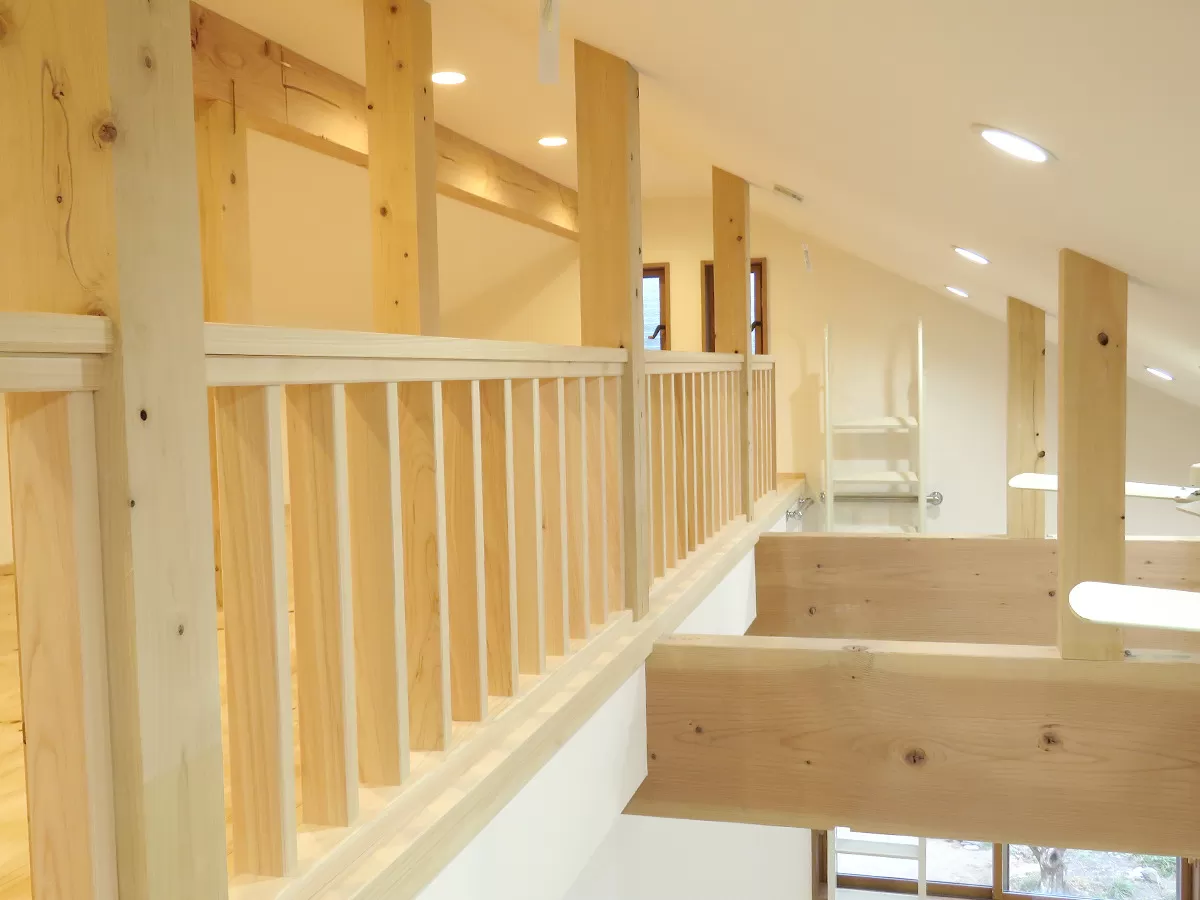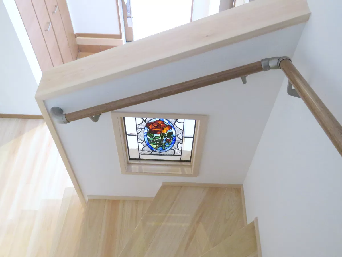 施主様のお母様が趣味でされている、ステンドグラスを付けたいとのことで、玄関からの光が入り込む階段に、はめ込みでステンドグラスを配置しました。風、光が十分に入るってこれこそ自然界の省エネ空間なのです。